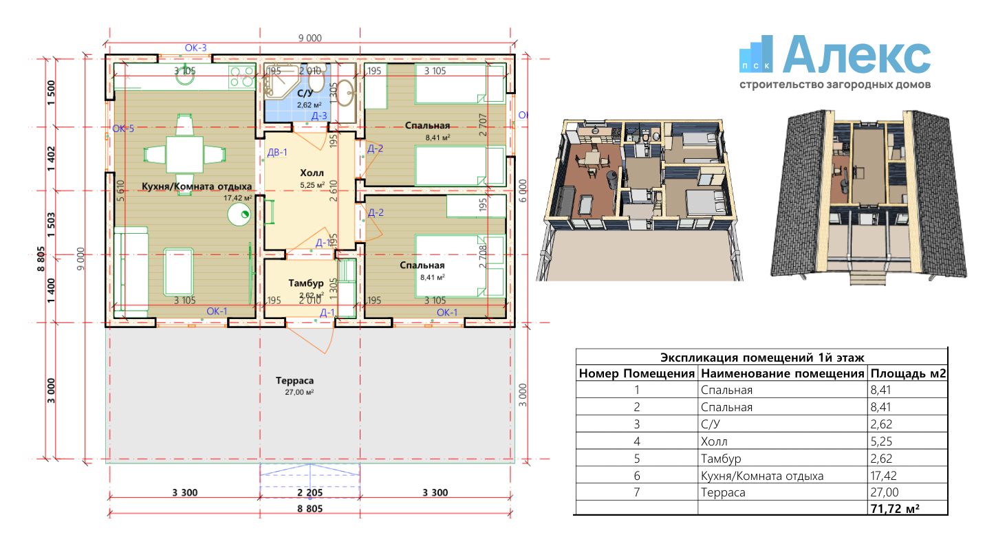 Общая площадь: 71,72 м² (без учета чердачного помещения)